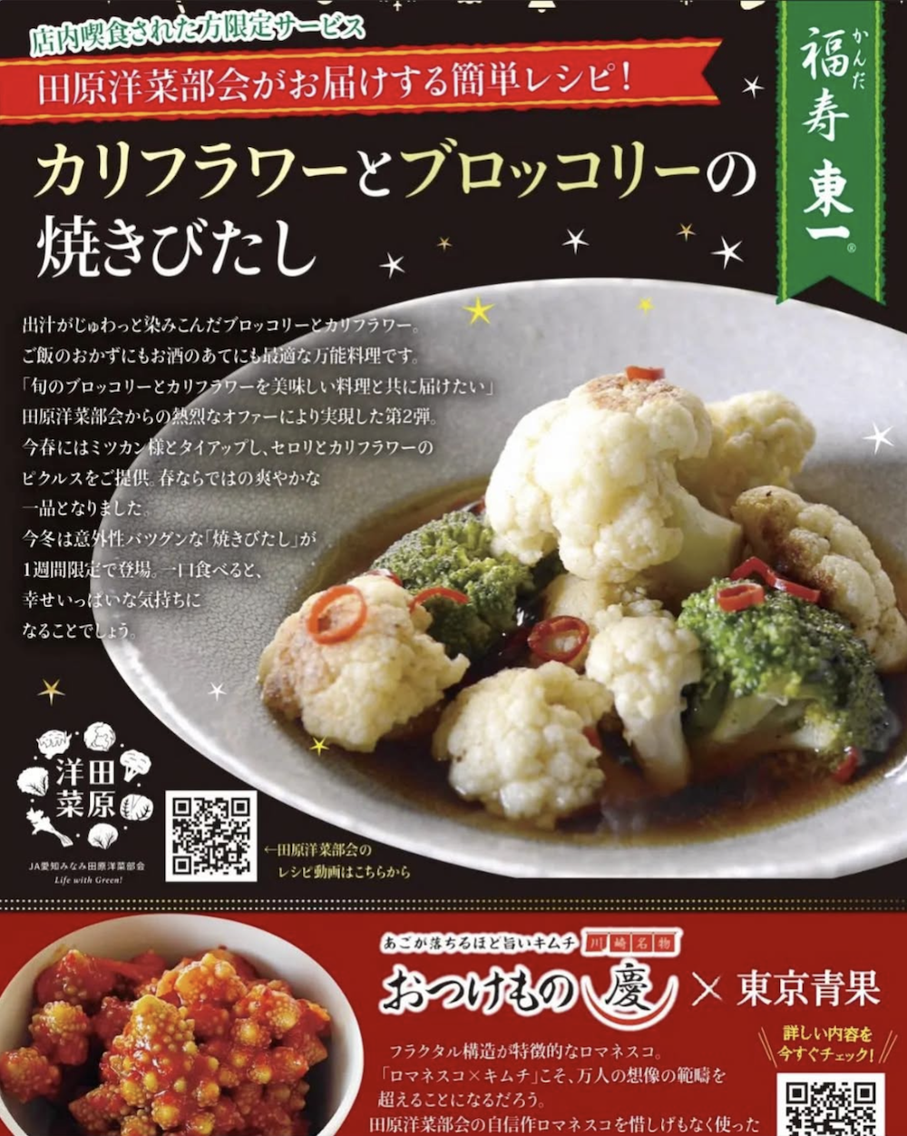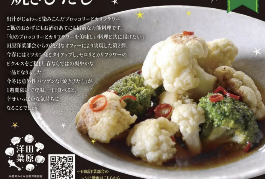 田原洋菜の野菜を使用した、「カリフラワーとブロッコリーの焼きびたし」を【かんだ福寿】様で提供していただける事になりました!